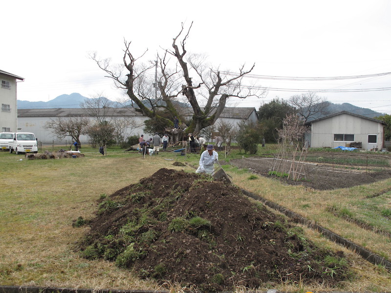 まずは大量の盛り土を地元の人たちにも協力してもらい退かす作業を行いました。幸い、不治の病気にはかかっておらず、地形的にも手入れがしやすい環境が整っていました。とはいえ、元はトラックで運び込まれた大量の土も根を傷つけるわけにはいけませんので重機で取り除くことはできません。硬く踏み固められた土を手作業で丁寧に取り除いて離れた場所に移動させます。